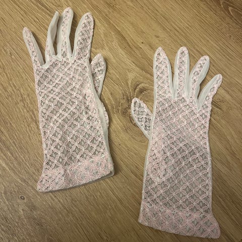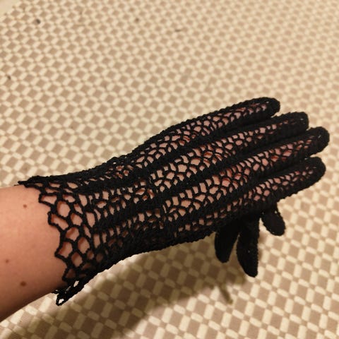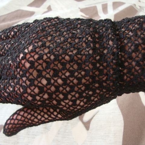 Virkattu vintage pitsikäsine ilman sormenpäitä. Oikealle kädelle. Kunto oikein hyvä. Venyvä ja sopii aikuiseen ja myös leikkiin "hienon neidin" käteen.