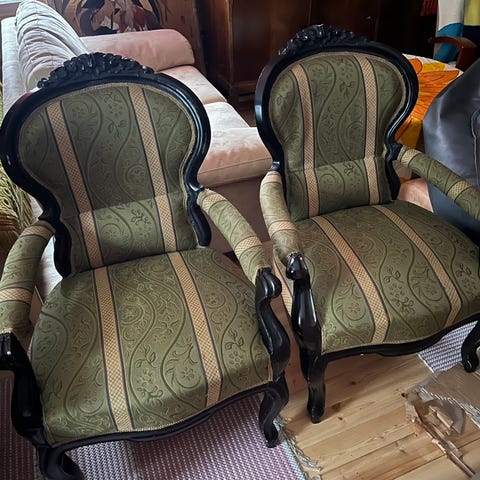 Vanha sohva Kalajoella toimineen Santaholman sahan konttorista. Mukaan kaksi saman tyylistä tuolia.