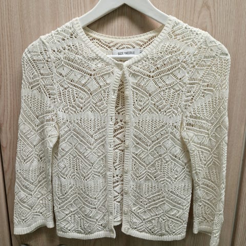 Puuvilla neuletakki, pitsisomisteet ja 3/4 hihat. Siisti käytetty kunto.