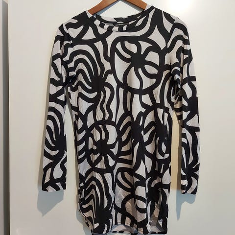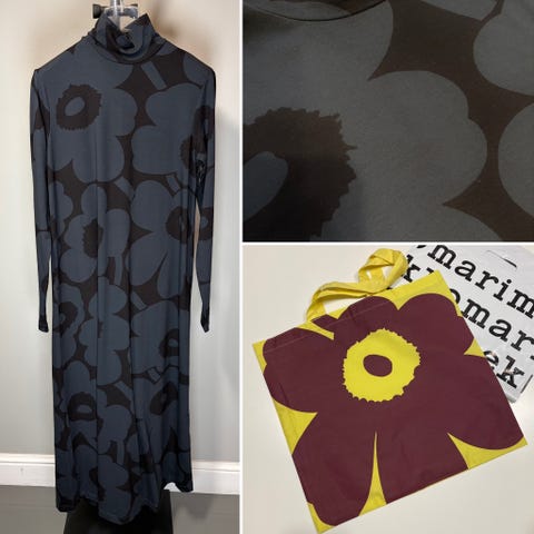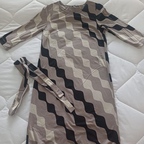 Marimekon Vuono mekko, jota ei käsittääkseni enää valmisteta. Vahvaa, laadukasta kangasta. Koko XS, reilu hyvin istuva malli. Nouto Lahden keskustasta.