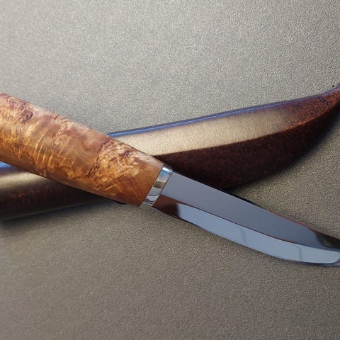 Metsästyspuukko, terä käsin taottu. Omalla logolla. Terän materiaali hopeateräs. Kahva ja tupen alaosa raidan juuripahkaa. Tupen alaosaan on upotettu eläimen kuva intarsiamenetelmällä . Tuppi on itse ommeltu naudan parkkinahasta. Hintaan sisältyy puukko tuppineen, kannatinlenkkiin ostajan haluamana joko lyhyt nimi tai nimikirjaimet. Lisäksi lahjalaatikko ja tuoteselostus.