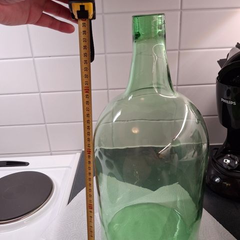 Iso lasipullo kaatotelineessä. Tilavuus 4,5 litraa korkeus 53cm. Tikkuaski vieressä antamassa mittasuhdetta.