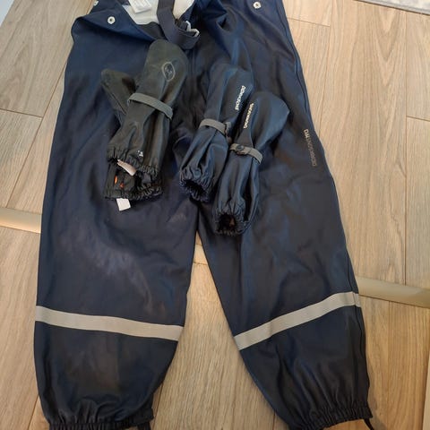 Mustat Lindexin kurahousut, koko 122 ja Reiman kurahanskat koko 4. Molemmat uutena ostettuja. Kurahousut olleet käytössä vain kerran, hanskat muutaman kerran.
