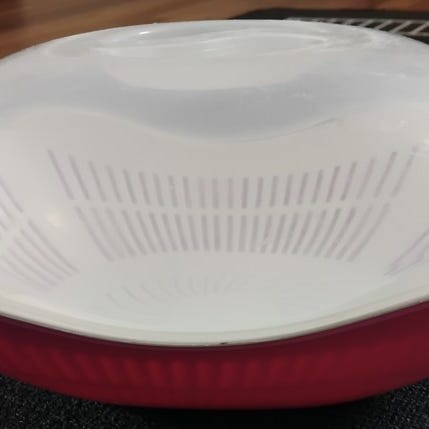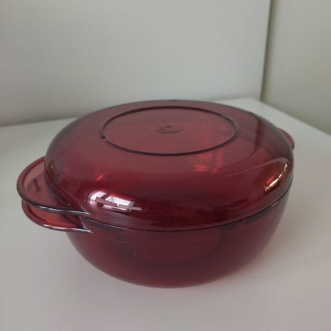 Erittäin siisti peruspunainen kannellinen säilytysrasia.