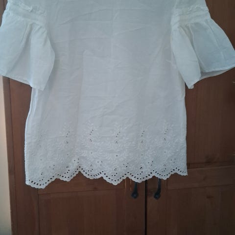 Kaunis luonnonvalkoinen paita jossa pitsihihat ja pitsiselkä. Koko S. Myös musta ja keltainen valkoisella pitsillä myynnissä.