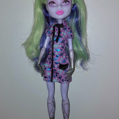 Monster High Ghoulia Yelps nuken vaatteita, kenkiä ja ym. oheistarvikkeita sekä pari ständiä. Sisältää mm. "Deadfast asun" paidan ja hameen tuplana (katso viimeisen kuvan kortti). Nouto tai lähetys