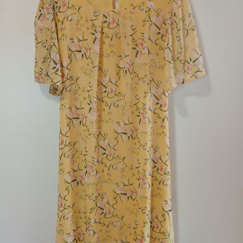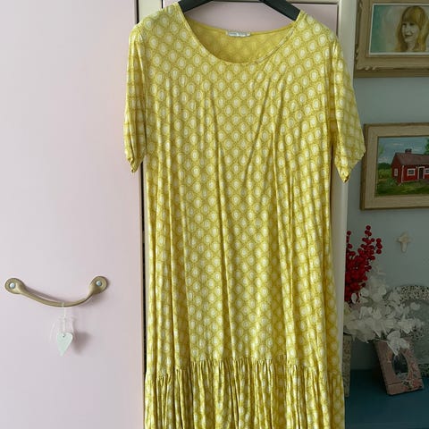Kelta-valko ruudullinen kesämekko jossa edessä napitus ja takana solittava kiristysvyö. Koko: kai-kai 51cm, pituus edestä 127cm.