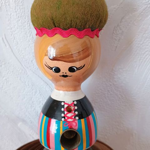 Nukke ja virkattu neulatyyny nuppineuloille. Nuken korkeus 9cm.
