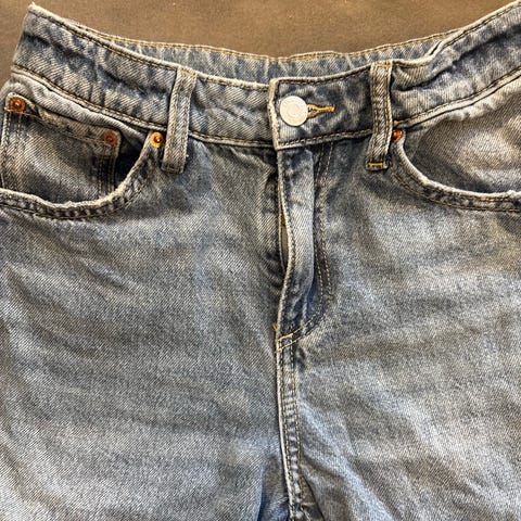 Vähän käytetty, takataskua kohdalla haalea pieni läiskä, muuten farkut erittäin hyväkuntoiset.