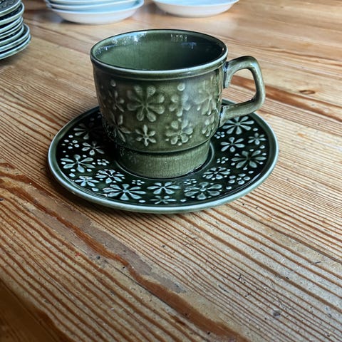 Hakusanoja: Tams tassi, asetti, kahvikupin alunen, englantilainen kahvikuppi, lautanen, alanen, kahviastiasto, posliinikuppi, kahvilautanen, ympyröitä ja kukkia, palloja ja raitoja, retro, vintage, rusehtava, ruskeankeltainen