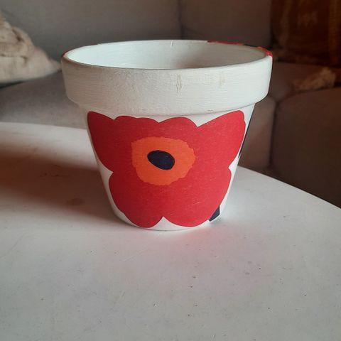Myynnissä on Marimekon unikkokuviota muistuttavasti maalattu kukkaruukku.
