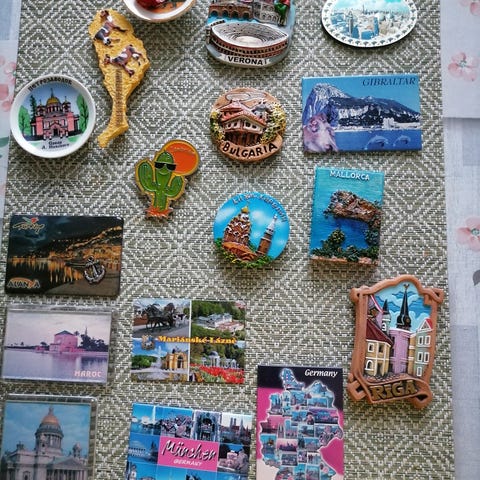 Jääkaappimagneetit. Osassa käytönjälkiä mm. naarmuina/kuvan haalistumisena jne.