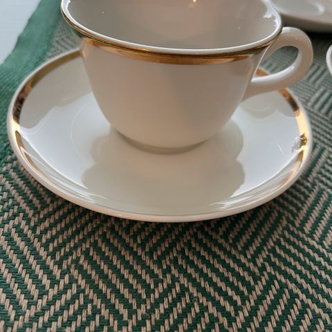 Myyn ajattoman kauniit Arabian vanhat, valkoiset kahvikupit, joissa on kultareunus kupissa ja asetissa. Kupin korkeus noin 5,5 cm ja halkaisija 7 cm. Kuppien ja asettien pohjassa on Arabian punainen piippuleima.