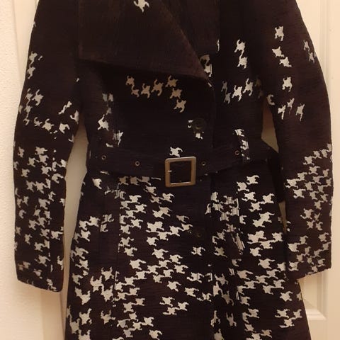 Musta, tukevaa materiaalia oleva takki, kankaan pinnassa kiva kuosi. Alaspäin levenevä ja hyvin istuva malli. Sopii välikausitakiksi mutta myös talvikäyttöön. Huom koko on 36 mutta koko pieni, lähempänä 34:ää.