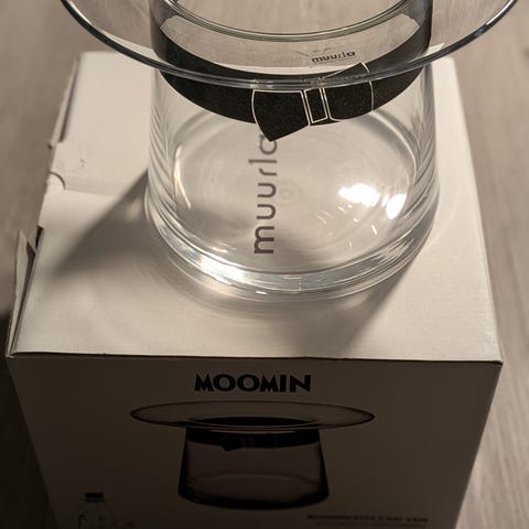 Muurlan lasimaljakko, muumipapan hattu. Korkeus 14 cm ja yläosan leveys 19 cm.