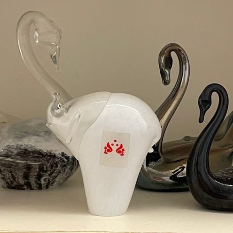 Kaksi studiolasin lasi joutsenta, punainen ja vihreä. Ovat ehyitä. 20€/kpl