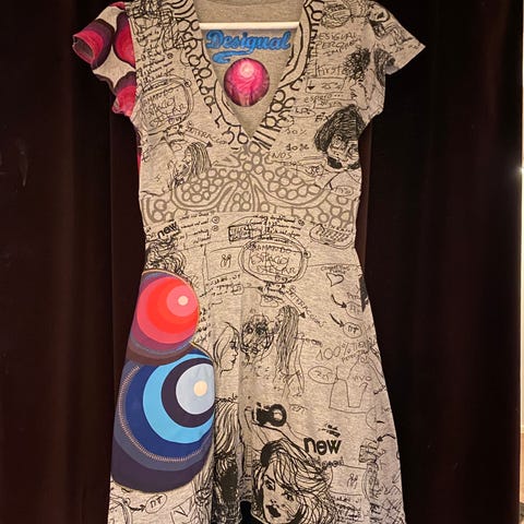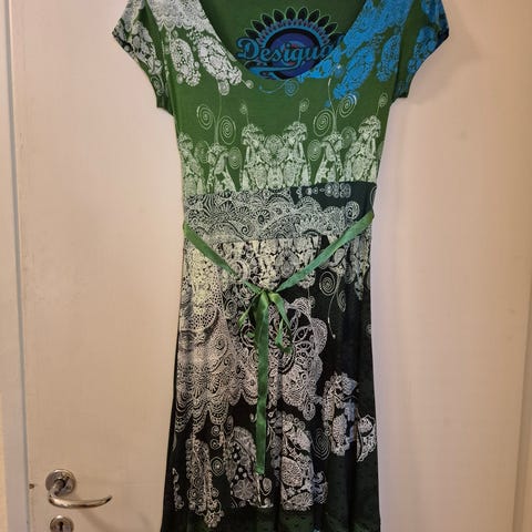 Desigual-mekko trikoota, 100% viskoosi, koko XS. Helmassa harmaa pitsinauha, vyötäröllä satiininauha.