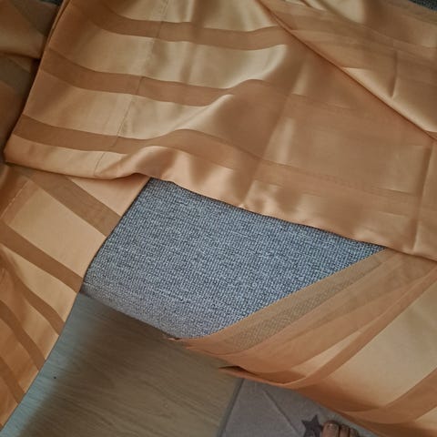 Hedelmäkuvioiset, läpikuultavat, rypytysnauhalla varustetut verhot 2 kpl. Korkeus 200 cm, leveys 128 cm. Siistit ja puhtaat silitystä vaille valmiit ikkunalle.