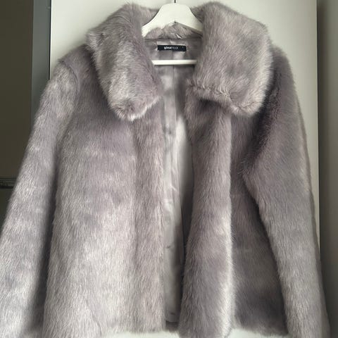 Beigen värinen, ihanan pehmeä tekokarvatakki. Käy juhlapukeutumiseen. Oikein mainio wanhojen mekkojen yläosaksi. Hääpukujen kanssa myös menee. Koko L, kai kai n. 53. Ei pahemmin jousta. Väri vaalea maitokahvi. Mmm