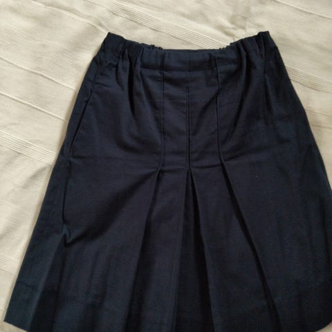 Tumman sininen puolihame .Kuminauha vyötärö ,sivussa tasku ,edessä ja takana vekit .koko n.152cm .Hp5€. postikulut ostajalle.