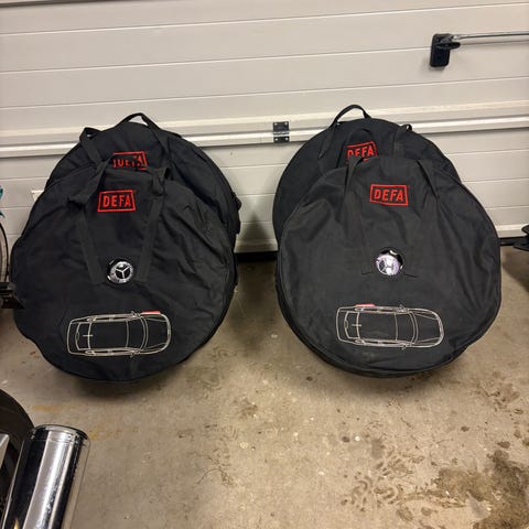 Ehjät säilytyskassit, vahvan oloista kangasta. Vetoketjuilla suljettavissa. Tuuletusreiät keskellä. Yhden pussin halkaisija n. 68 cm, korkeus n 25 cm.
