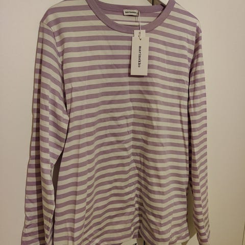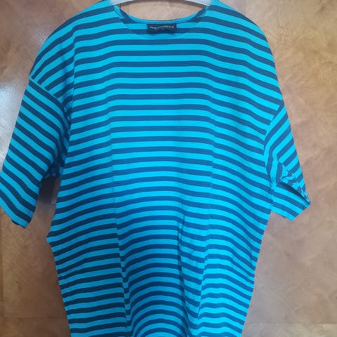 Myydään Marimekko tasaraita lyhythihainen t-paita. Koko M. Kuosi on tasaraita ja materiaali puuvillatrikoota. Kaunis väriyhdistelmä, jonka valmistus lopetettu. Uusi ja käyttämätön, laput kiinni. Lyhythihainen paita on valmistettu klassisesta Tasaraita-kuosisesta puuvillatrikoosta. Paidassa on resorikantti pääntiessä ja sen malli on suoralinjainen eli malli on unisex. Hinta on jo tingitty, ei tori diiliä. Postitus onnistuu ostajan maksamana.