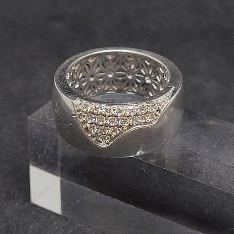 Espritin 925 hopeasormus. Yli sentin leveä, painava! Koko näyttäisi olevan 18, mutta koska on näin leveä niin max 17 koon sormesta lähtee vielä poiskin.