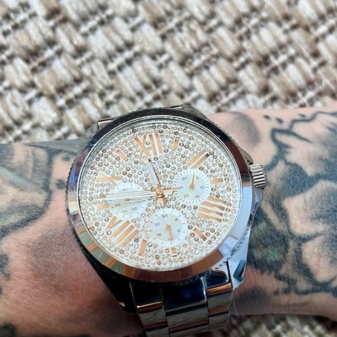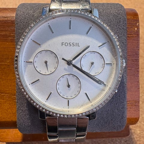 Muutaman kerran käytössä ollut kaunis korumainen Fossil rannekello. Kello on erittäin hyvässä kunnossa. Rannekkeessa on muutama pintanaarmu (mattapintaisessa kohdassa). Kellon pituutta voi säädellä helposti lisäkappaleilla joita on mukana kuvan lisäksi vielä 2 palaa.