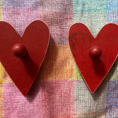 2 kpl pikkunaulakoita. Sydänkuvio ja rusetti, kiinnityskoukku takapuolella. Korkeus 16 cm, leveys sydämen kohdalta 8 cm.Hinta yhteensä 4€