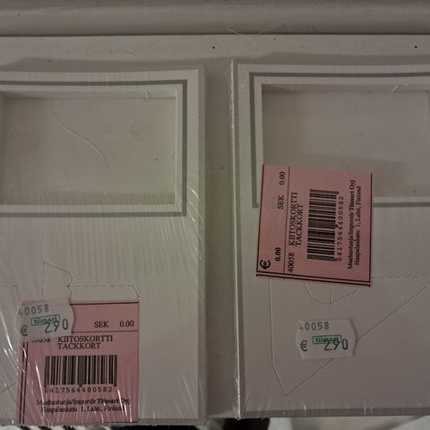 Avaamaton 20 kpl paketti kuvakehys kiitoskortteja taittamattomana, ei sisällä postituskuoria. Takana on valmiiksi painettu seisontatuki, joka pitää avata muotoonsa halutessaan, sekä nuuttausviiva kortin taittamista varten. Taitettuna kortin koko on 8,2 ×10,2 cm. Vain nouto. Maksu käteisellä.