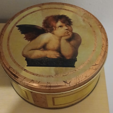 Vanha pahvirasia jossa Enkeleitä kuvassa kannen päällä ja pitsiä. Pientä kulumaa kannessa, huomioitu hinnassa. Koko 16× 16 cm ja korkeus kannen kera 6,8 cm.