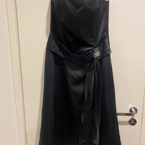 Naisten/tyttöjen musta vuorillinen sifonkimekko juhliin. Koko S. Irrotettavat olkaimet. Joustava yläosa.
