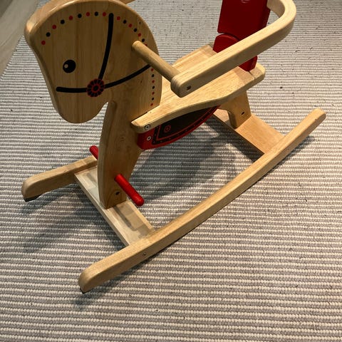 Jykevä, mäntyinen keinuhevonen. Pituus 97 cm, korkeus 67,5 cm ja leveys 40 cm. Istuinkorkeus astinlaudalta satulaan 31 cm. Irrotettava satula. Ks. 3 kuvaa. Puussa vähäisiä käytön jälkiä, yleisvaikutelma siisti.