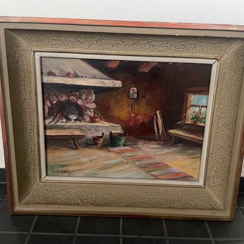 Kuva Vanhanajan pirtistä. öljyvärimaalaus. A. Hakalan tuotantoa vuodelta 2011