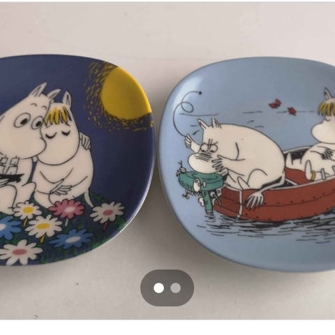 Matala muumilautanen (halkaisija 19,5 cm) Tiuhti ja Viuhti kuviolla. Kaksipuoleinen. Hetken käytössä ollut, mutta hyväkuntoinen. Arabia.