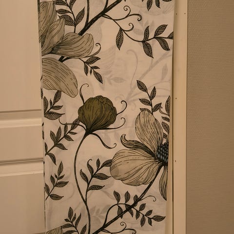 Vallilan Opera kangasta iso pala, josta saa kaksi pitkää verhoa. Kangasta noin 5m, ja sen leveys 150cm. Tummat kukkakohdat vähän niinkuin kohokuvioita kankaassa, tuntuvat käsiin.