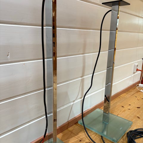 Tyylikkäät ja sirot hopeanharmaat lattiajalustat kaiuttimille.