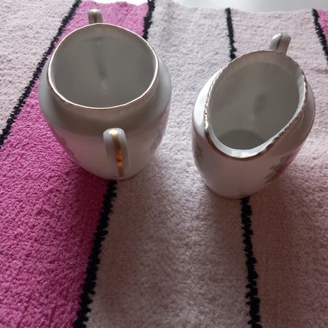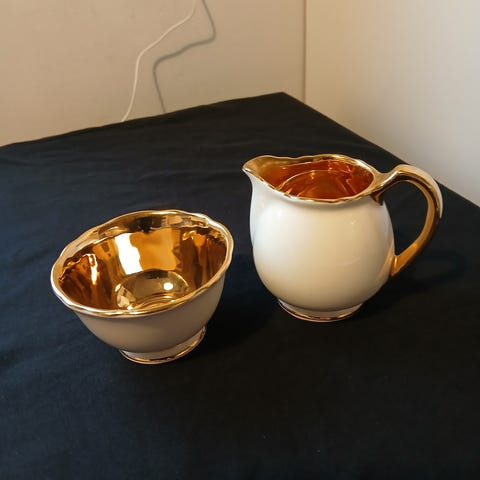 Kermanekka ja sokerikko + pieni tarjotin. Kuppien korkeus 6,5 cm, halkaisija n. 9 cm. Tarjotin 26x17 cm. Kevyttä metallia. Vähän hapettunut paikoin.