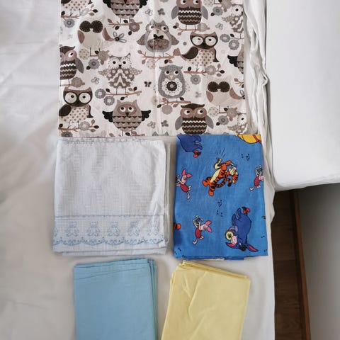 Vauvalle Pehmeitä puuvillaisia pussi- ja aluslakanoita. Myös pinnasänky kokoa. Koko kuvissa. Pieni pupuviltti. Kaikki 10 e. Kankaista ompelemalla saa tyynyliinoja