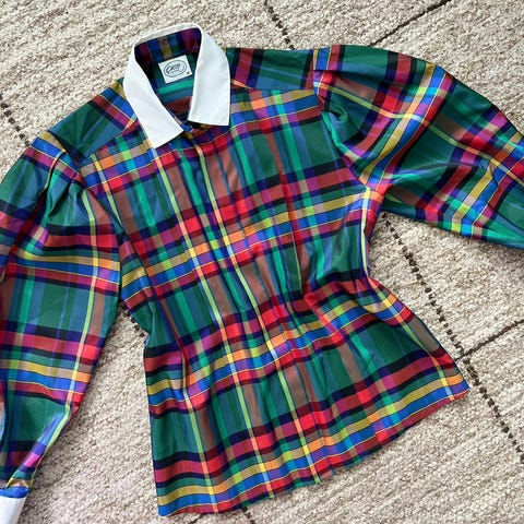 Lyhythihainen vintage paitapusero ( arviolta M-koko ) Kainalo-kainalo 54 cm ja niska-helma 68 cm. Ei materiaalilappua, mutta on keinokuitua, hyvin laskeutuvaa kangasta. Hyväkuntoinen ja siisti.