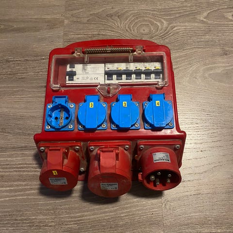 Toimivalaite. Löytyy 16a, 32a kolmivaihe sekä yksi vaihe valovirta pistokkeita. Kahta mallia toisessa syöttö 63a. Toisessa 32a. Isompi 80€ pienempi 60€