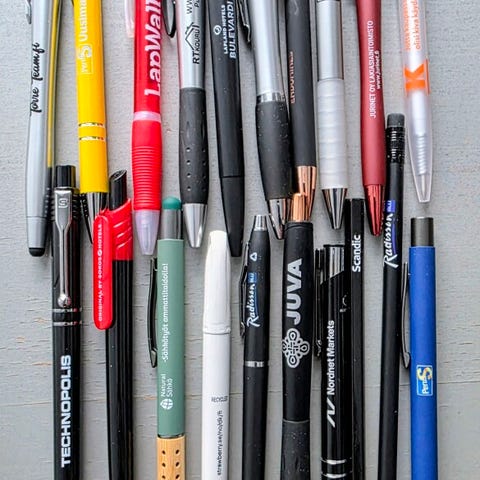 Mainoskyniä ym. yhteensä 23 kpl. Muste on kuivunut kynistä.