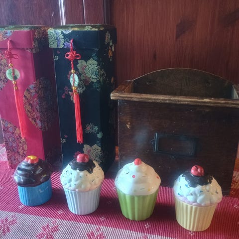 Pieni puinen säilytysrasia, esim. tulitikkuaskeille. Uusi, käyttämätön. Sammatin Katrilli Finland. Suomalainen tuote. Sisämitat 4x6cm. Takaosan korkeus 12cm, etuosan korkeus 8cm. Pohjassa 2 reikää, halkaisija 1,8cm. Reikien avulla säilytystavara voidaan työntää rasiasta ylöspäin. Rasia voidaan kiinnittää seinään. Etuosassa maalaus, jossa hiiret hyppivät kärpässienitalon katolla ja siniset kukat kukkivat.