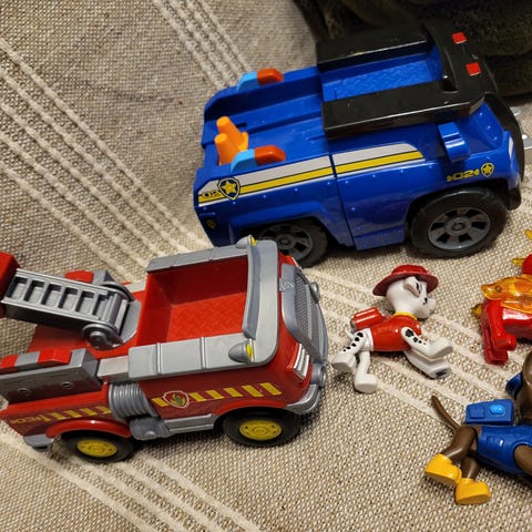 Myydään Ryhmä Hau Kaja ja ralliauto. Ralliautossa toimii äänet. Kun ralliautoa vetää taaksepäin niin lähtee ajamaan eteenpäin ja samalla kuuluu ääniä. Pinnoissa kulumaa ja renkaat haalentuneet käytössä. Ajoneuvon tarrat on irronneet. Irronneiden tarrojen liimajäljet on putsattu pois.