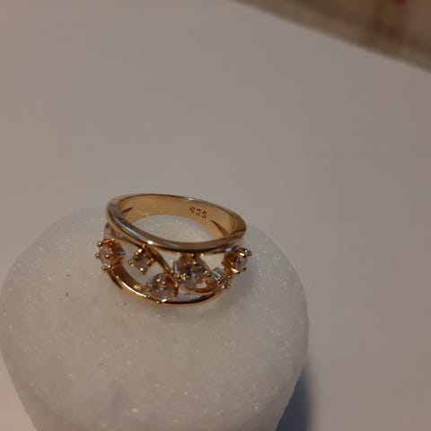 Sormus Kullanvärinen koko 7,5 sisähalkaisia 17,7 mm kirkas kauniisti hiottu kivi mitat 12 x 15 mm sormus on kullattu ei leimaa sormus on käyttämätön korupussi tulee mukaan kulkeutuu sovittaessa lähialuelle + postitus yht 20 eur