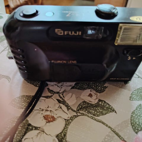 Filmirulla-kamera. Merkki Fuji,toimii täydellisesti. Sisällä tyhjä filmirulla ja yksi uusi rulla tulee mukaan. Salama toimii paristolla.