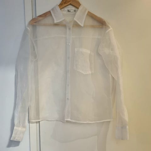 Harmaa/musta hihaton kauluspaita. Napitus kaulasta helmaan asti. Takaosa läpinäkyvää kangasta. Pitkä helma. Koko 40, sopii paremmin 38-kokoiselle. Olka-helma noin 73cm. Kainalo-kainalo noin 46cm. Selkäosan materiaali 100% polyesteria ja muuten 100% viskoosia.