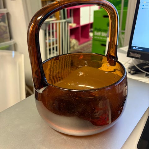 Kaj Franckin Sargasso-sarjaan kuuluva vihreä seinäkori. Tuotannossa 1972-1976. Pyörittäen puhallettu rakkolasi.