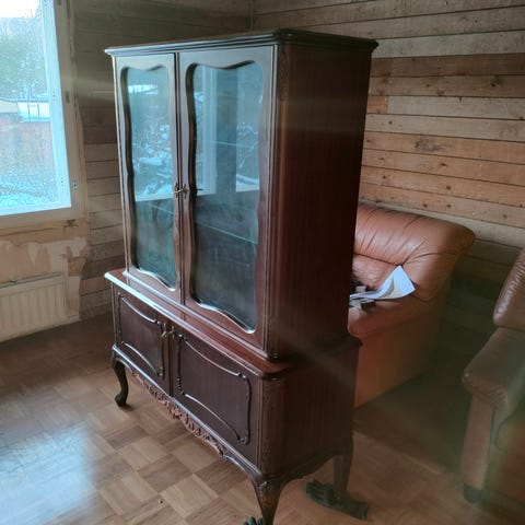 Tummaa puuta oleva pentikistä parikymmentä vuotta sitten ostettu vitriini. Koko 132x77x28. Jotain vuosien mukana tullutta käytön jälkeä varmasti on. Yksi ikkunaruuduista uusittu ja yllä tasossa alunperin jo ollut halkeama. Varsin siisti ja näppärä kaikenlaiseen säilyttämiseen. 450e