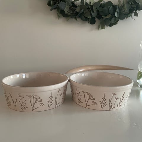 Ruoka kulhot, toinen matala ja toinen korkea.